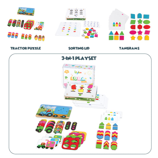 This 3-in-1 set includes a tractor puzzle, a sorting lid, and a tangram set for endless fun on-the-go.